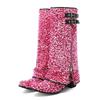 Módní dámské kozačky do půli lýtka s ohrnutým lemem, růžová látka se třpytkami, fialové vysoké blokové podpatky, zimní zateplené, kulatá špička, zip, kozačky nad půlku kalhot