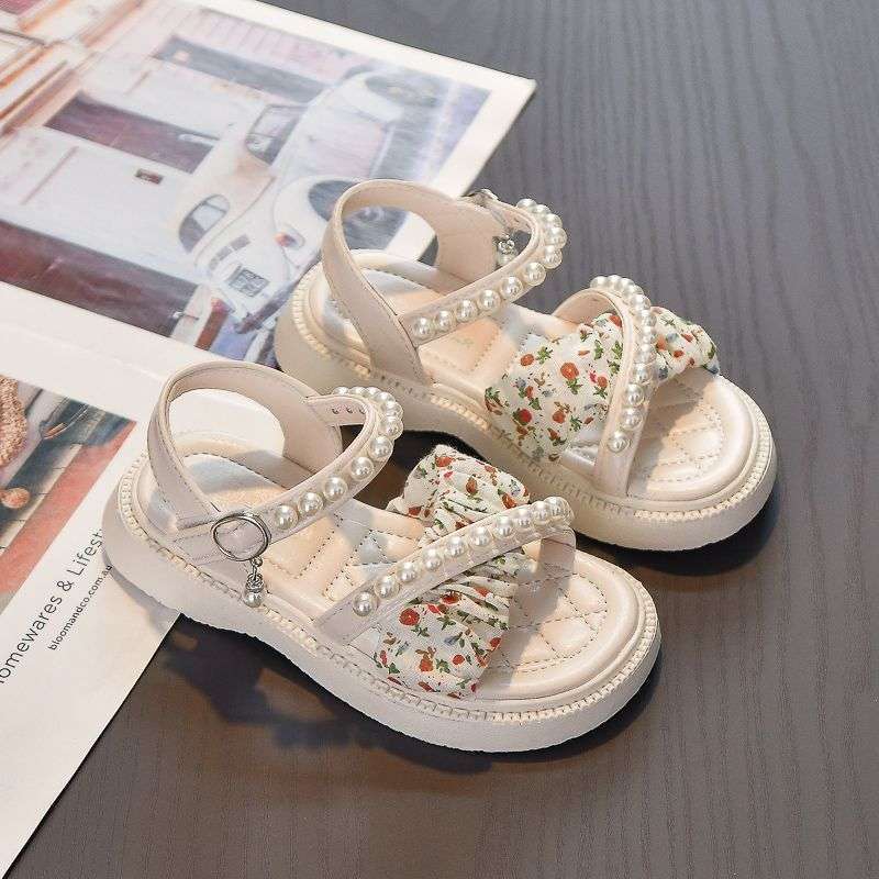 Girls sandals 2025 summer new children's pearl princess shoes little girl soft sole non-slip medium and older children's beach shoes