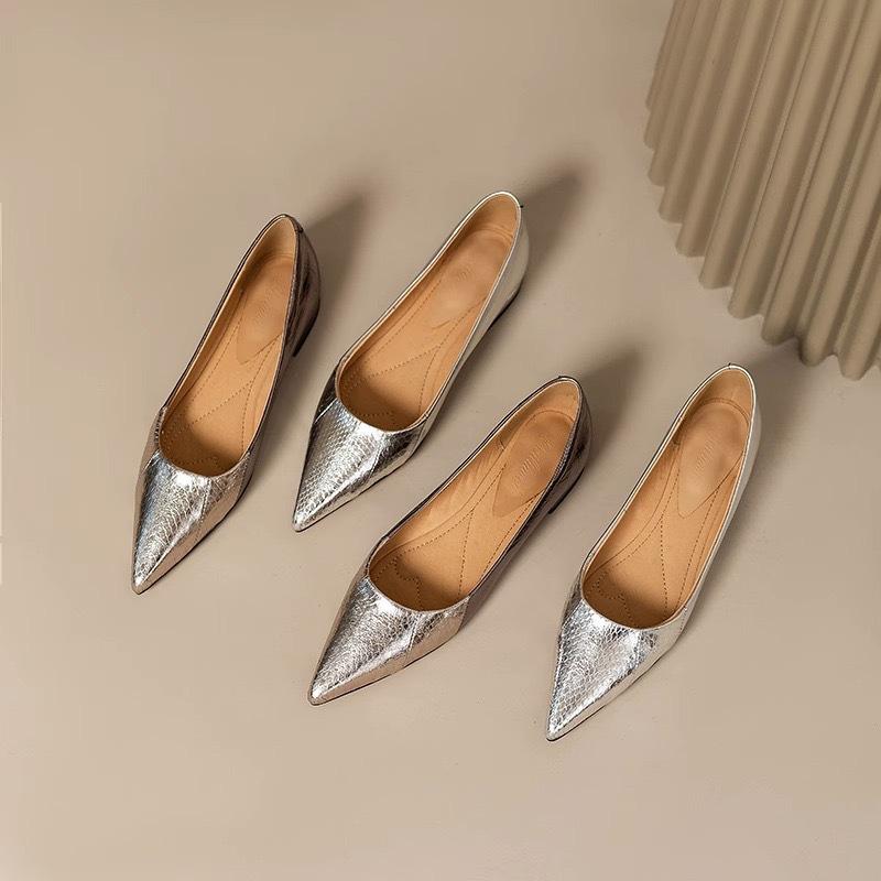 2025 spring and summer new leather pattern pointed head low heel flat shoes light mouth four seasons versatile women's shoes silver temperament single
