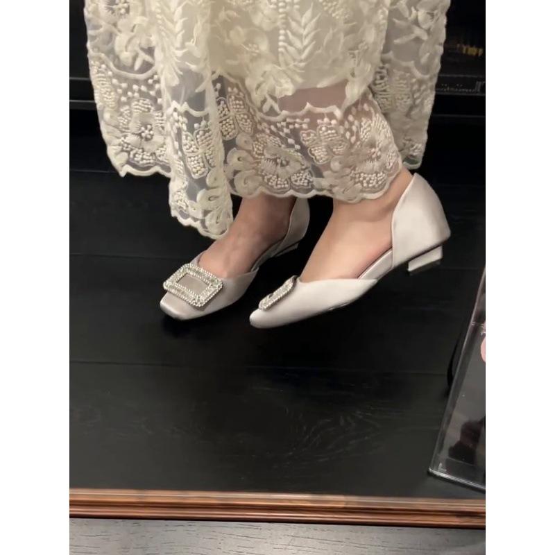 Inner heightening version~ Niche low-heeled rhinestone square buckle shoes, shallow-mouth single shoes for women, French commuter hollow sandals for