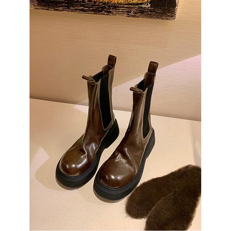 Verze z hovězí kůže~ Grape Mom stejné Chelsea kotníkové boty na silné podrážce dámské kulatá špička elastický pásek silný podpatek středně vysoké holenní boty Martinovy boty