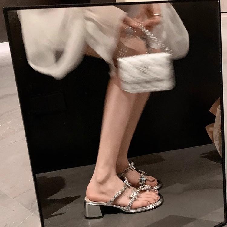Su Yinyin's same butterfly drag~ Square head butterfly rhinestone buckle cover toe thick high-heeled slippers women's sandals outside