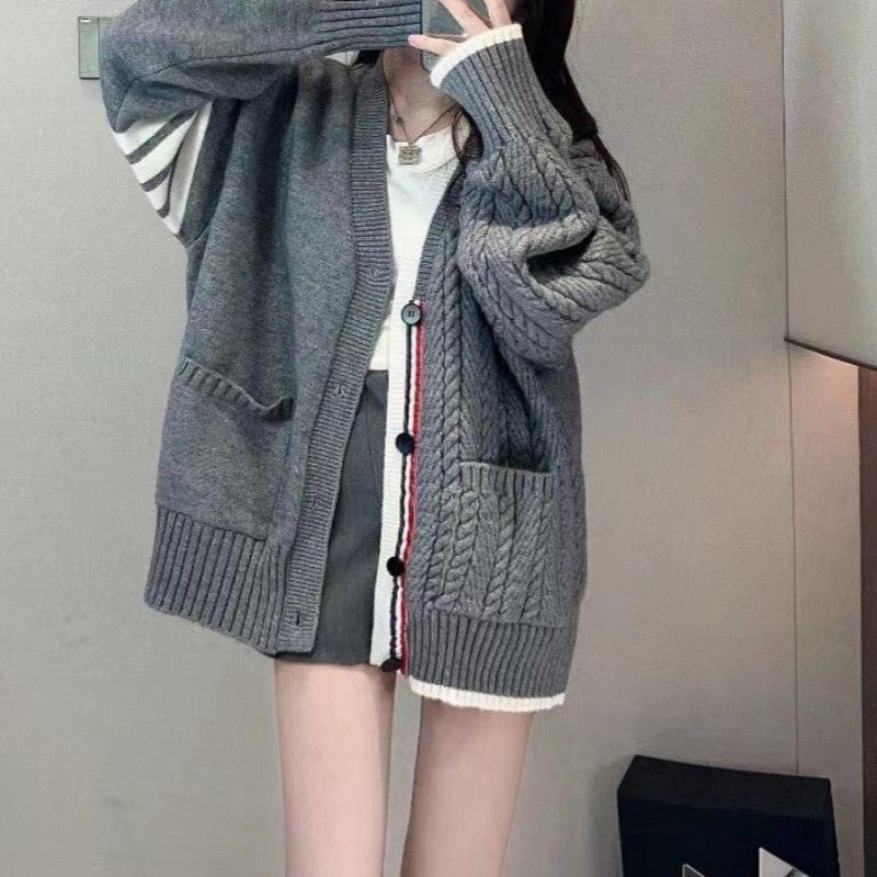 College style loose neck sweater jacket women's autumn and winter new soft waxy versatile contrasting color twist cardigan
