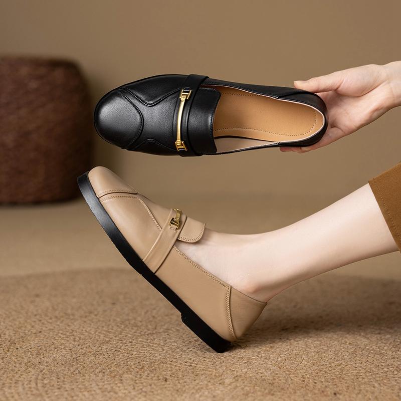 Fashion Women's new leather, cowhide, metal accessories, round toe, low heel, comfortable, plus size single shoes, casual shoes