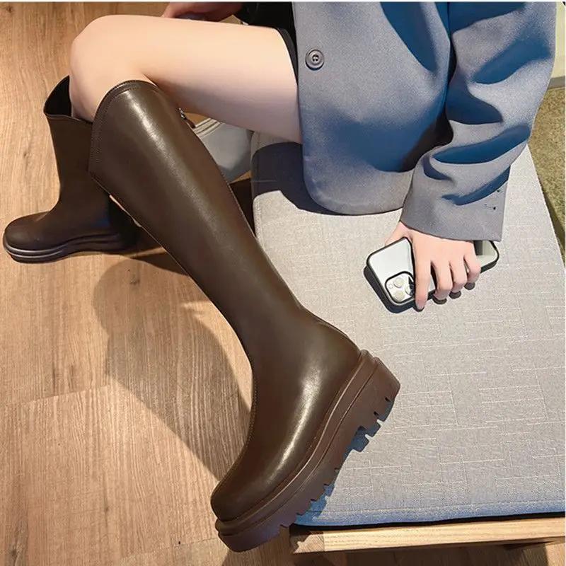 Fashion Leather Platform Round Toe Women's Half High Boots Chic and Elegant Large Size Warm New Rock Ladies Mid Calf Shoes on Promotion