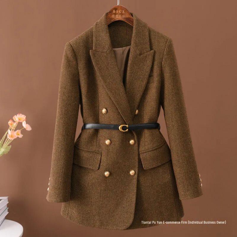 Dámské vlněné dvouřadé módní sako střední délky 2024: Podzimní/zimní kolekce