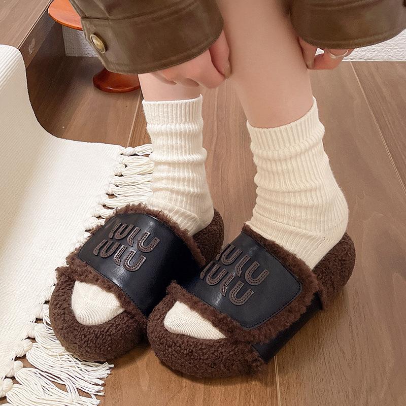 Thick bottom fluffy slippers women wear 2025 autumn and winter new fashion Internet celebrity leisure fairy style lamb wool one-word drag