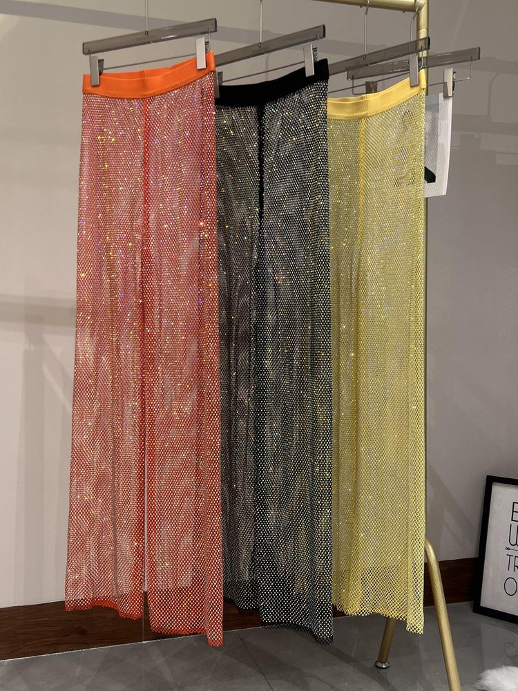 Letní sexy síťované kalhoty s výřezy a kamínky se širokými nohavicemi do nočního klubu