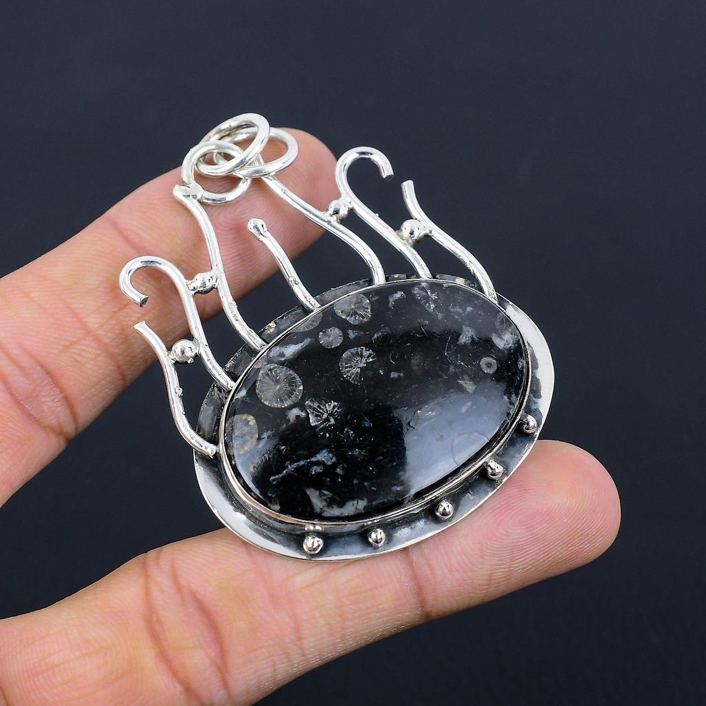 925 Silver Root Chakra Natural Black Fossil Coral Wife Artisan Pendant Jewelry