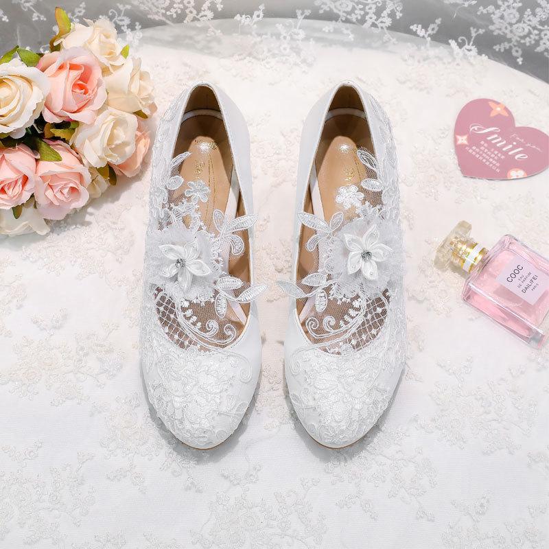 White lace high heels waterproof table round head wedding shoes large size fashion women's shoes rhinestone shoes flower bridesmaid shoes 43