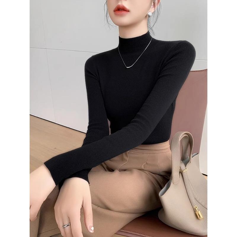 Autumn and winter black temperament semi-turtleneck knitted sweater women's new long-sleeved bottom sweater top