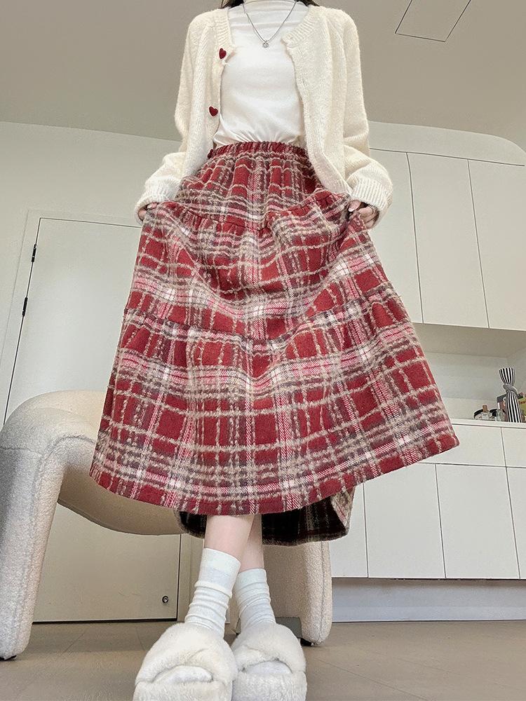 Classic over-sized checkered midi skirt for women Fall/Winter high waist A-line shape , retro cake skirt .
