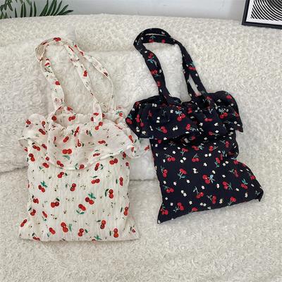 New cute and sweet girl portable shoulder bag large capacity cherry print lotus leaf edge tote bag
