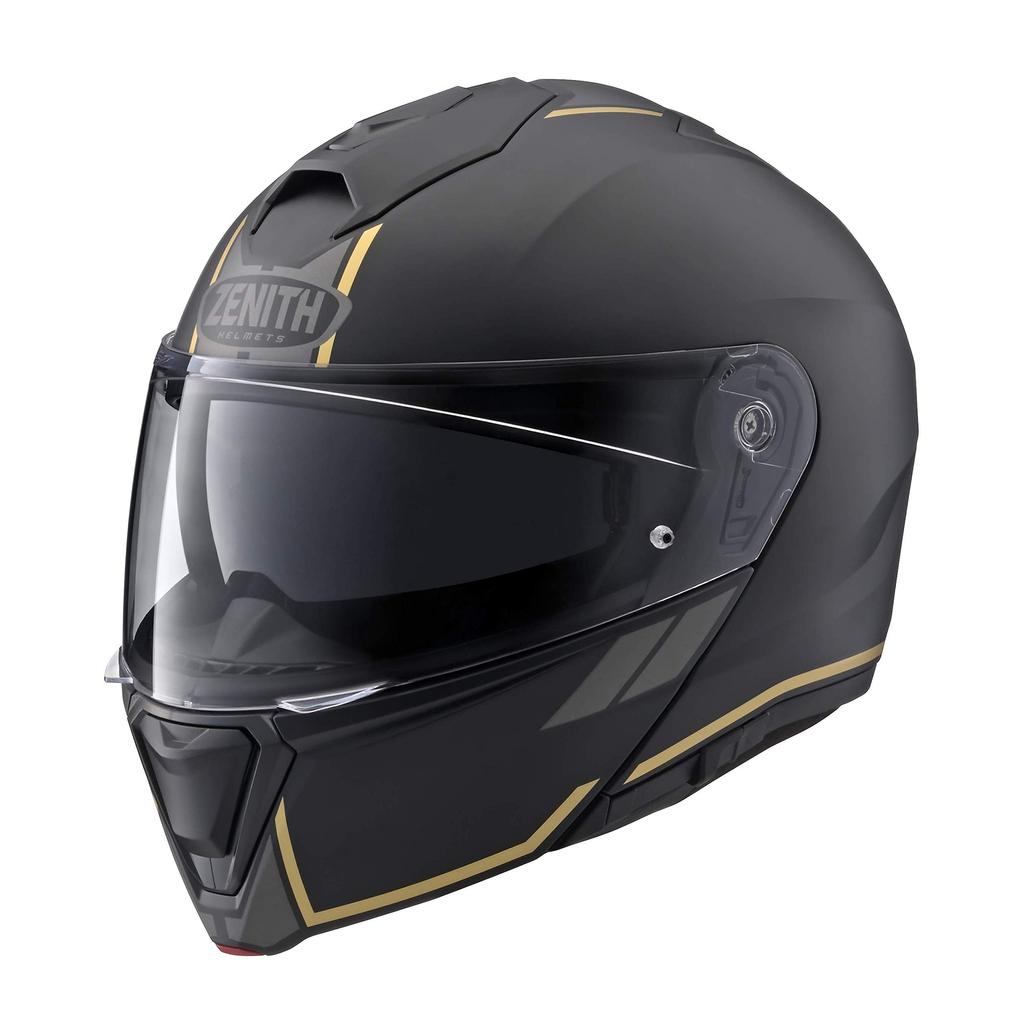 This motorcycle system helmet with a sun visor combines the look of a full-face helmet with the comfort of a system helmet.