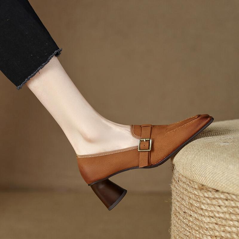 Fashion NEW Fall/Summer Women's Pumps Genuine Leather High Heels Square Toe Chunky Heel Shoes for Women Buckle Women Loafers Party Shoes
