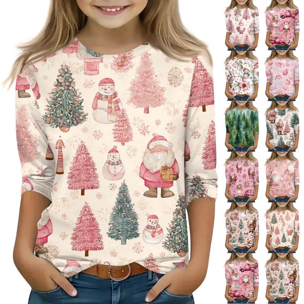 Vánoční potisk Topů pro dospívající dívky 4-11 let Kulatý výstřih 3/4 rukávy Módní topy Outfit Trička