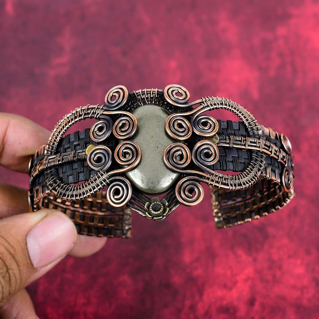 Pyrite gemstone cuff bracelet copper wire wrapped adjustable bangle handmade bangle designer cuff bracelet copper wire jewelry gifts for her