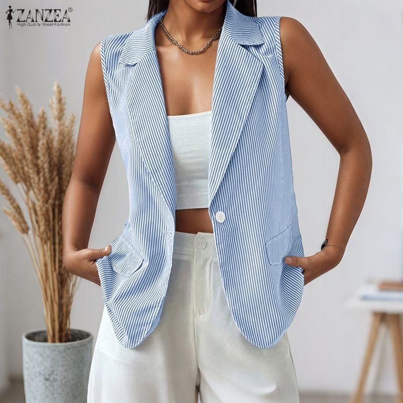 ZANZEA Women Casual Turn Down Collar Sleeveless Stripe Cardigan Vest