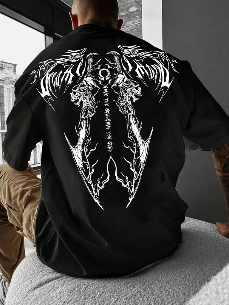 Pánské tmavé tričko s anime potiskem Stylové streetwearové grafické tričko Design plamenů a mečů Ležérní tričko s krátkým rukávem a kulatým výstřihem Léto