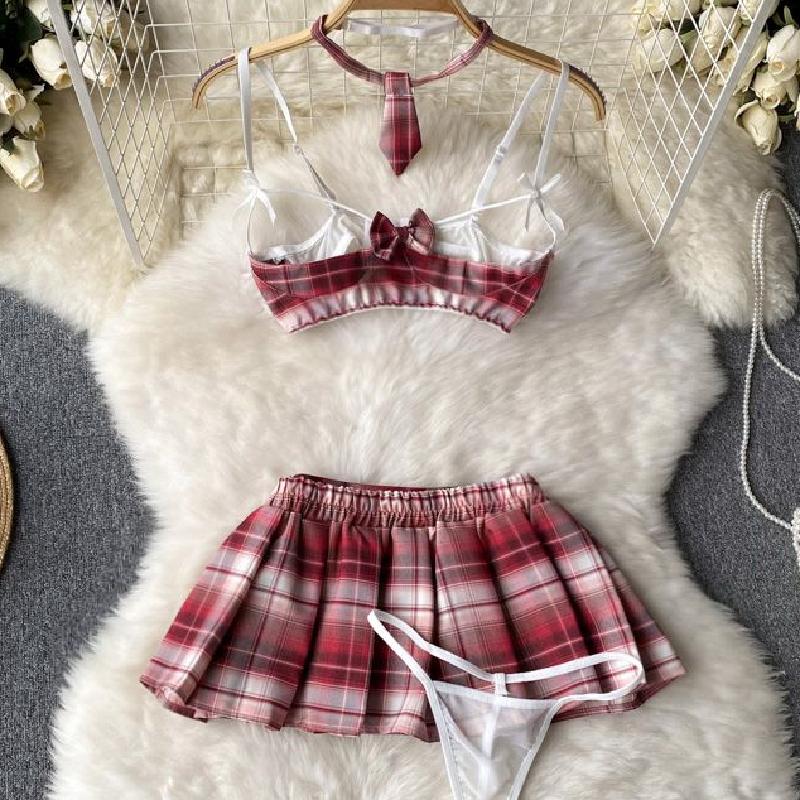 Cute Hollow Bra Plaid Miniskirt Roleplay Student Uniform Temptation Women Cosplay Schoolgirl Costumes Couples Sexy Home Clothing