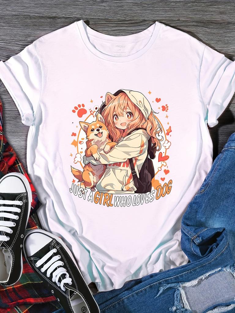 Anime Print T-shirt Casual Short Sleeve Crew Neck Top For Spring & Summer Women's Clothing