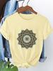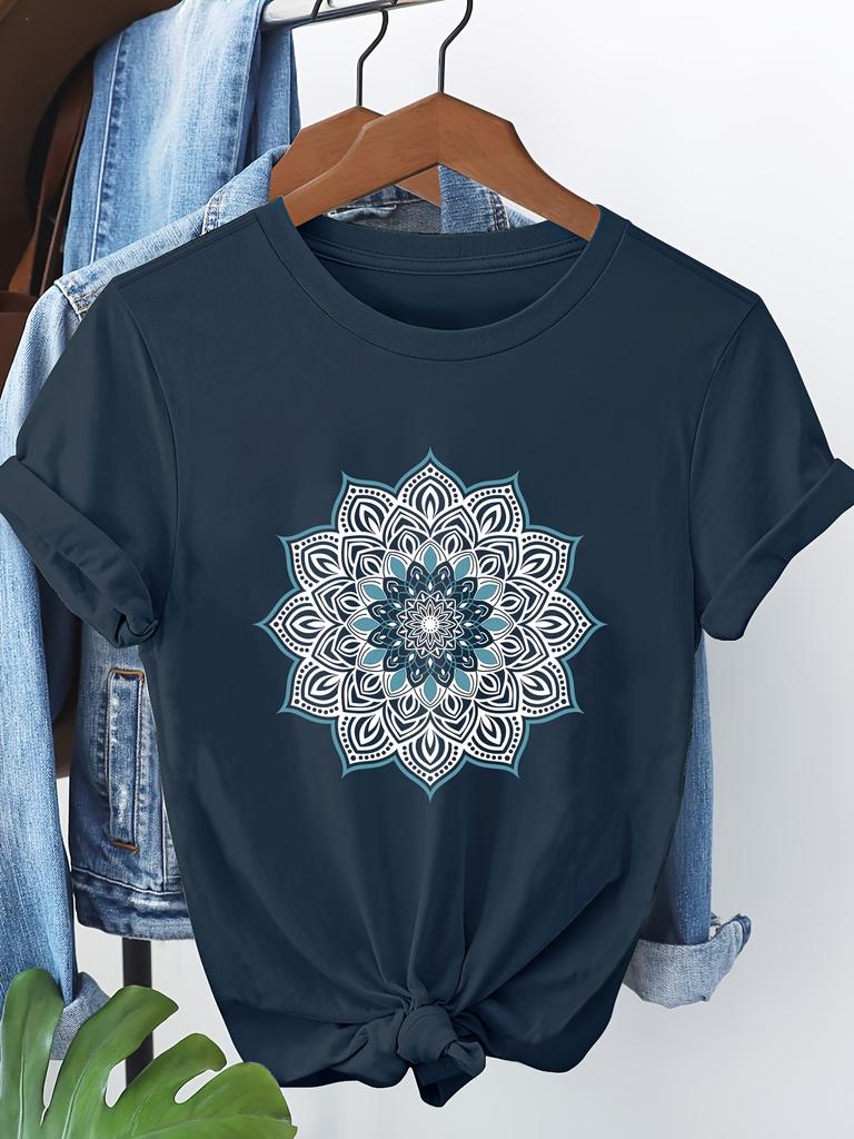 AWomen's Floral Mandala Print Short Sleeve T-Shirt Casual Round Neck Top with Teal Black Artwork Urban Style Printed T-Shirt
