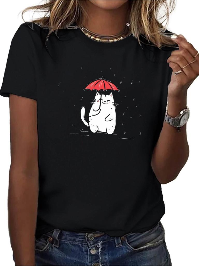 Dámské měkké tričko s roztomilou grafikou kočky a deštníku Pohodlný ležérní střih Černé s bílým designem Minimalistický styl