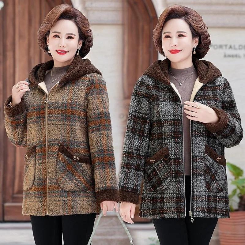Kabát pro ženu středního věku Zimní parky Tvídový vlněný kabát Fleecová zateplená bunda s vatovou výplní Dámské nadměrné Teplé svrchní oblečení