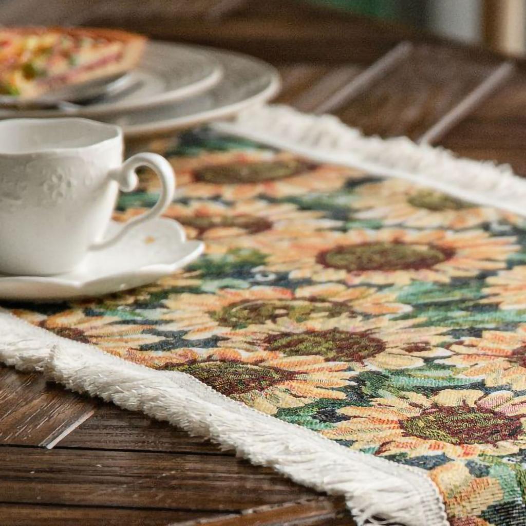 Jutový běhoun na stůl žakárový vzor slunečnice americký styl se střapci dekorace běhounu na stůl na párty žlutý