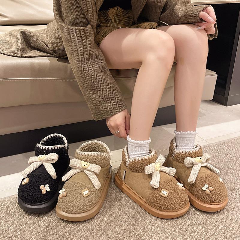 Warm edge new snow boots women's winter warm cute bear wearing bow high-top thickened cotton shoes