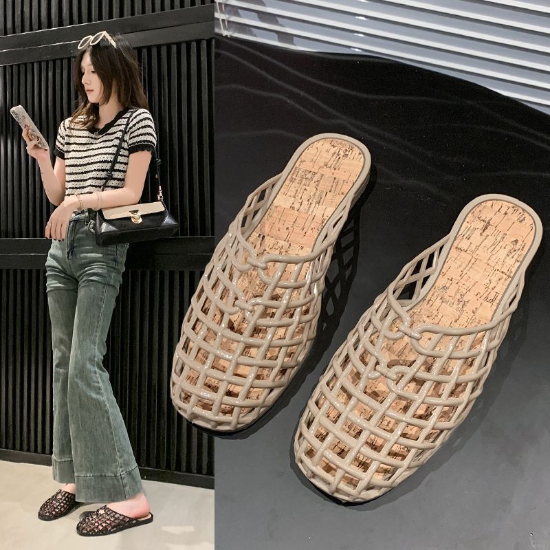 Fashion mesh non-slip flat bottom hole beach sandals transparent bag head hollow slippers 2025 summer and autumn new