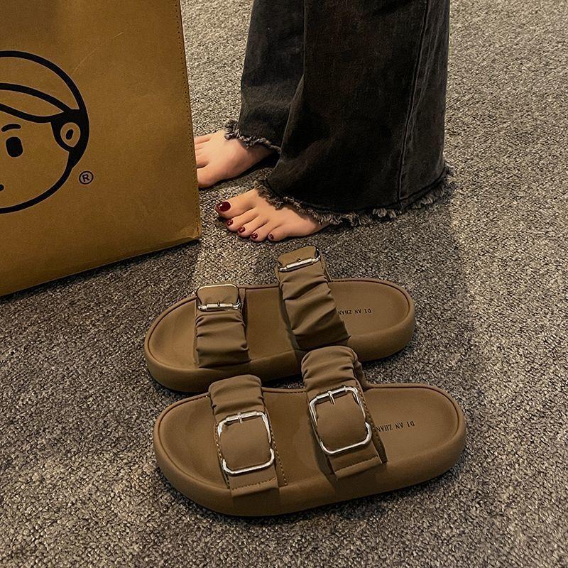 Summer outer wear flat bottom non-slip thick bottom stepping on shit feeling one-word drag 2025 new cool slippers pregnant women beach sandals women