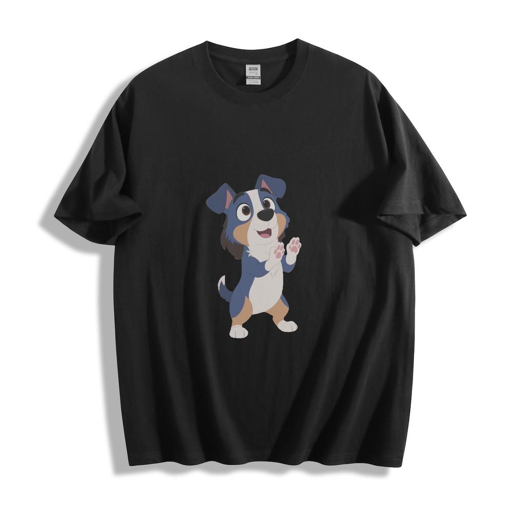 Kreslené modro-bílé tričko s grafikou tleskajícího psa
