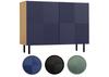 Buffet, corps noir avec portes bleues, comprenant deux tiroirs à panneau unique et deux compartiments de rangement ouverts.
