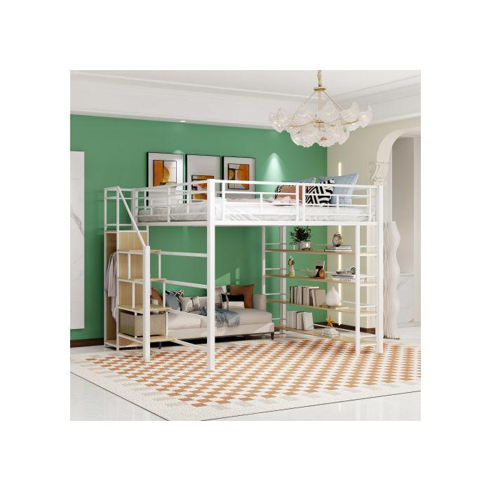 Lit mezzanine - MUVOE - 140x200 cm - Escalier de rangement - Finition blanche - Sécurisé