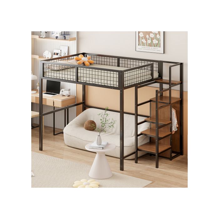 Lit mezzanine - MUVOE - 140x200 cm - Métal - Échelle de sécurité - Rangement intégré