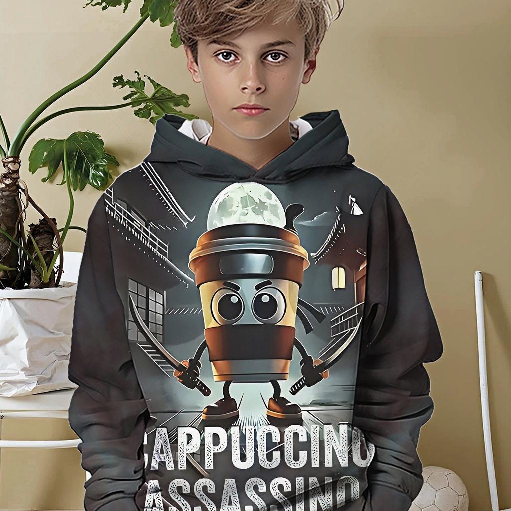 Boys' Fashion Hoodie - Cappuccino Ninja Coffee Cup Print, Oriental Mystery Atmosphere Digital Design, Long Sleeve Hoodie