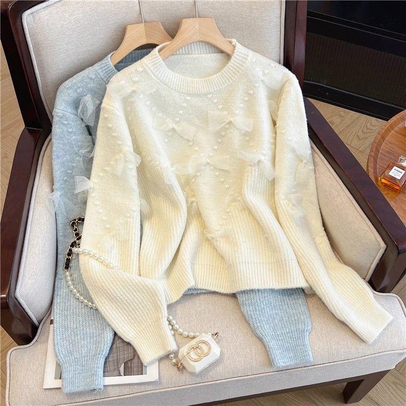 Mesh Bow Women's Sweater Long Sleeved Round Neck Knitted Sweaters New Spring Autumn Trendy French Woman Top