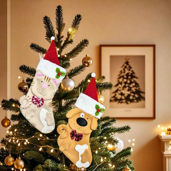 Vánoční punčochy Plyšový design kočky a psa Santa Claus Vánoční punčochy Velký otvor Držák na bonbony a dárky Závěsná dekorace na stromek a krb