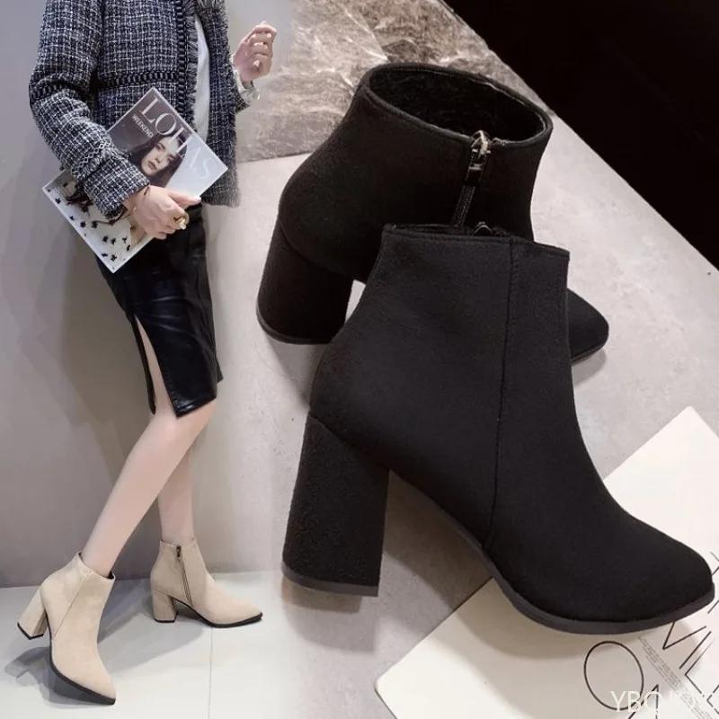 Women's Warm Boots Fashion Mid Heel Autumn New Style Side Zipper Suede Tip Versatile Comfortable Coarse Heel Women's Shoes