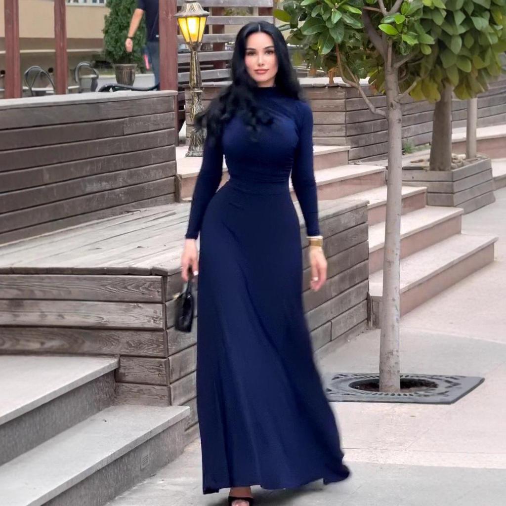 Elegantní podzimní dámské šaty 2025, evropský a americký styl, s dlouhým rukávem, kulatým výstřihem, přiléhavé v pase