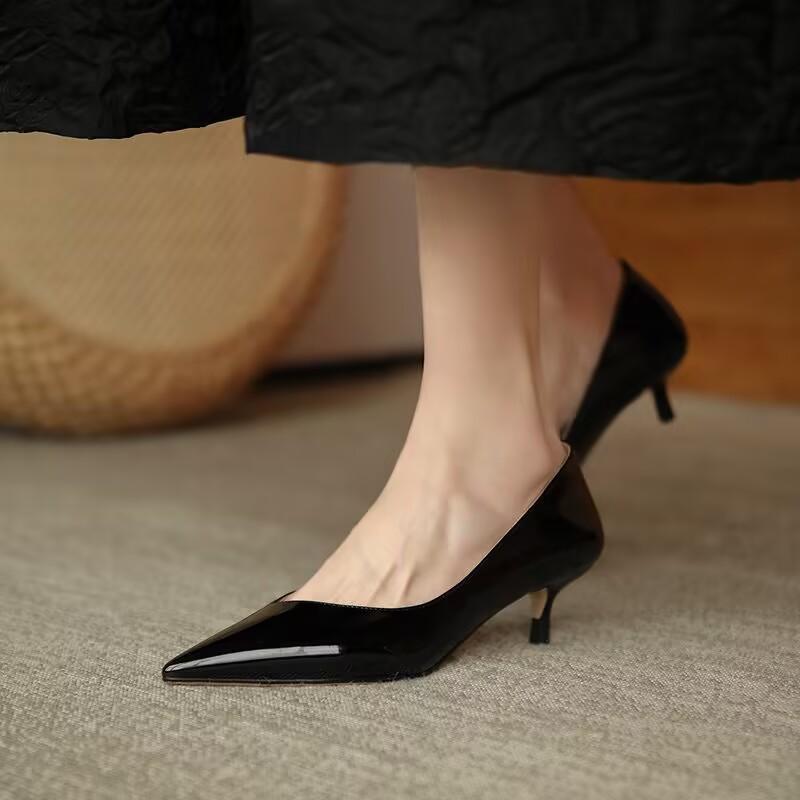 Pointed cat heel single shoes women's spring 2025 new products simple commuter light mouth leather shoes V mouth thin heel high heel single shoes