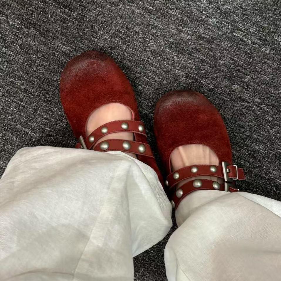 Polished round head light mouth rivets one word with late evening breeze single shoes women's 2025 autumn new women's inner height increase Mary J