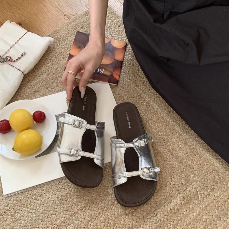 Flat-bottomed slippers one-word slippers double-buckle women's shoes 2025 summer new outer wear beach French versatile cool slippers