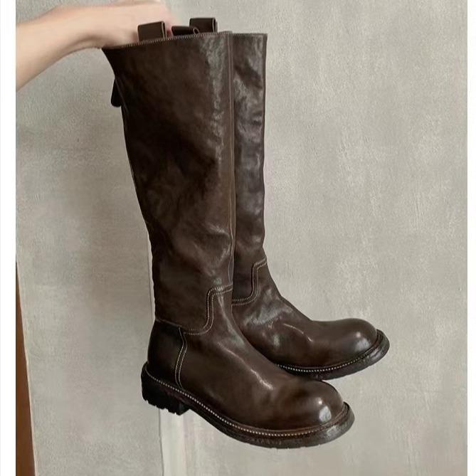 Cowhide version~ Grape mother retro pleated thick-soled long-leg knight boots female British style thin leather high-leg boots