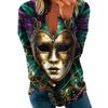 3D Mardi Gras Mask Printed Top Casual Long Sleeved Women's T-shirts - Soft Medium Stretch Polyester Fabric Spring and Autumn Relaxed Fit Clothing