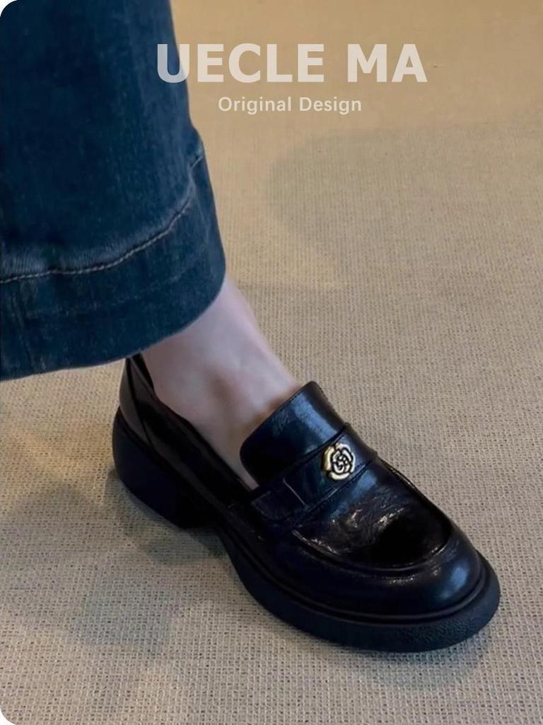 Cowhide~ Camellia platform loafers women's 2025 new leather retro single shoes one-pedal British small leather shoes