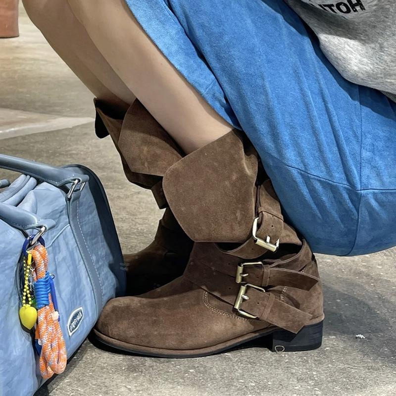 Cowhide version~ Korean niche belt buckle western cowboy boots women's matte two wear medium boots thick heel knight boots