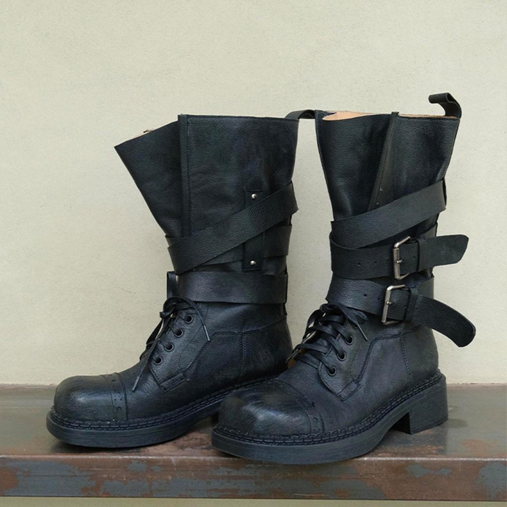 Cowhide version~ Wasteland handsome locomotive women's boots genuine leather wide tube Martin boots women's winter thick heel medium tube knight boots