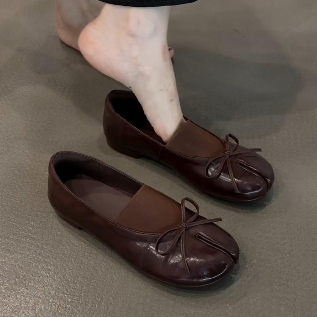 Cowhide~ Leather bow-toed shoes, pig's trotters, women's commuting elastic band, flat-bottomed retro ballet shoes, single shoes